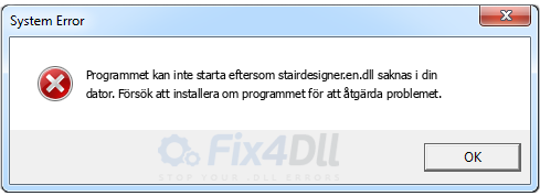 För att snabbt lösa problemet rekommenderar vi att du laddar ner och använder stairdesigner.en.dll Fix Tool. Om du har teknisk erfarenhet och vill installera en DLL-fil manuellt, vänligen välj din version av Windows och ladda ner stairdesigner.en.dll, efter det kopiera den till rätt plats med hjälp av instruktionen nedan, det kommer att fixa dll-fel.
